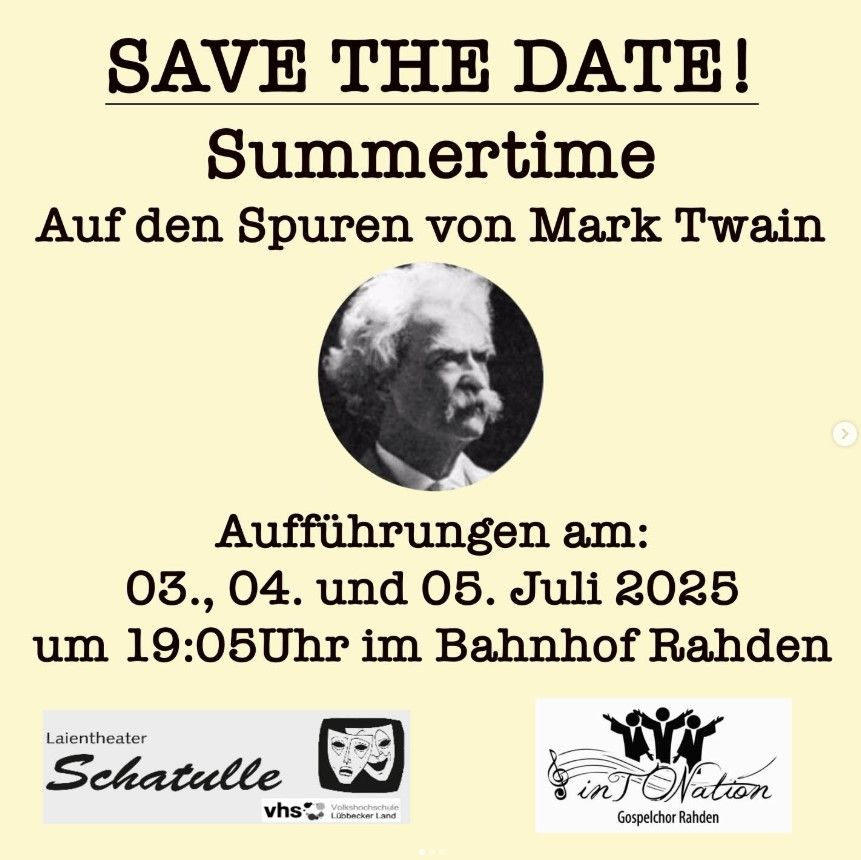 Am 3./4./5. Juli 2025 freuen wir uns auf ein erstmalig gemeinsames und für uns sehr besonderes Projekt mit der „Schatulle“ im Rahdener Bahnhof 🎭🎶🎹😊 Dazu spielt die Schatulle kein Theaterstück im eigentlichen Sinn. Es werden viele kleine Episoden aus dem umfangreichen Schaffen Mark Twains auf die Bühne gebracht. Diese bilden zusammen mit unseren Songs eine Art Collage zum Thema „SUMMERTIME“. 🌻☀️ Aus Erzählungen, Büchern und Reiseberichten von Mark Twain wurden Texte ausgesucht und in spielbare Bühnenfassungen umgeschrieben. Federführend arrangierte dies Edith Stöver. Ihr war besonders wichtig, alle Aspekte seiner humanistischen Erzählungen, seine genauen Beobachtungen zu den sozialen Umständen und seiner scharfzügigen Kritik an der amerikanischen Gesellschaft zu zeigen 📝 Die Proben im Chor laufen bereits auf Hochtouren und alle stimmen sich mit den Melodien auf „SUMMERTIME“ ein! 🥰🎶😊