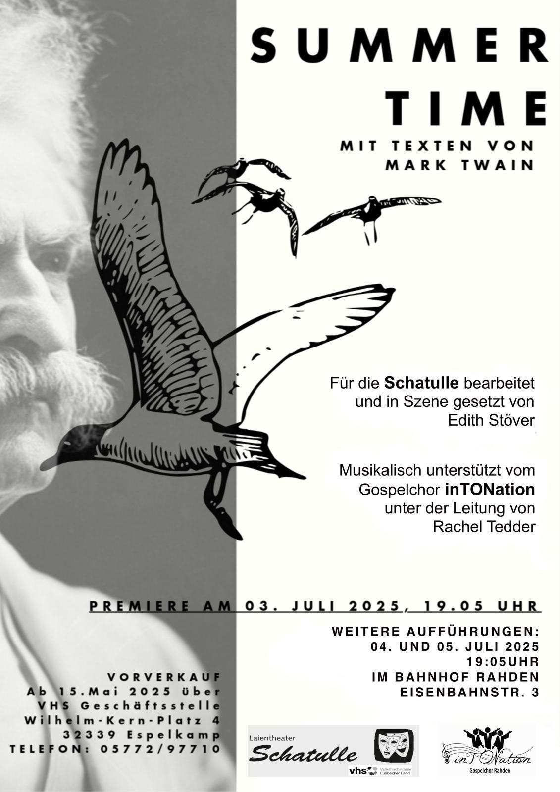 Am 3./4./5. Juli 2025 freuen wir uns auf ein erstmalig gemeinsames und für uns sehr besonderes Projekt mit der „Schatulle“ im Rahdener Bahnhof 🎭🎶🎹😊 Dazu spielt die Schatulle kein Theaterstück im eigentlichen Sinn. Es werden viele kleine Episoden aus dem umfangreichen Schaffen Mark Twains auf die Bühne gebracht. Diese bilden zusammen mit unseren Songs eine Art Collage zum Thema „SUMMERTIME“. 🌻☀️ Aus Erzählungen, Büchern und Reiseberichten von Mark Twain wurden Texte ausgesucht und in spielbare Bühnenfassungen umgeschrieben. Federführend arrangierte dies Edith Stöver. Ihr war besonders wichtig, alle Aspekte seiner humanistischen Erzählungen, seine genauen Beobachtungen zu den sozialen Umständen und seiner scharfzügigen Kritik an der amerikanischen Gesellschaft zu zeigen 📝 Die Proben im Chor laufen bereits auf Hochtouren und alle stimmen sich mit den Melodien auf „SUMMERTIME“ ein! 🥰🎶😊